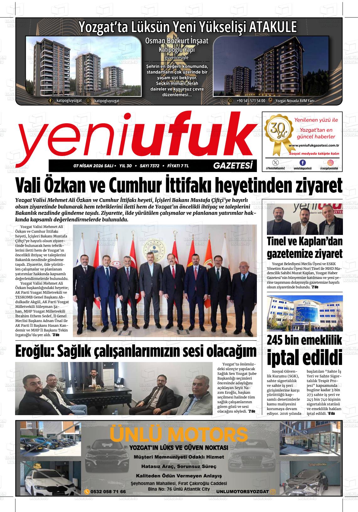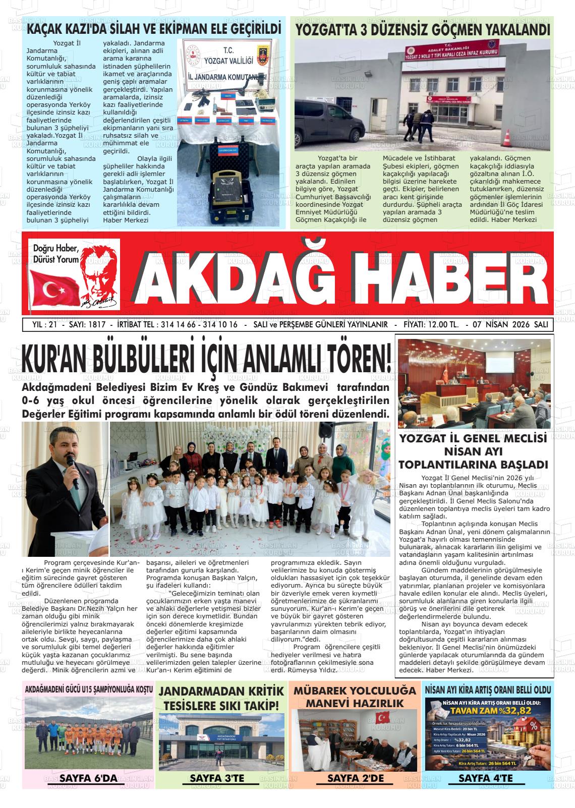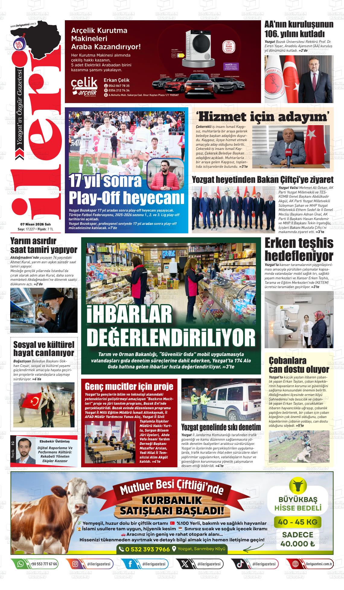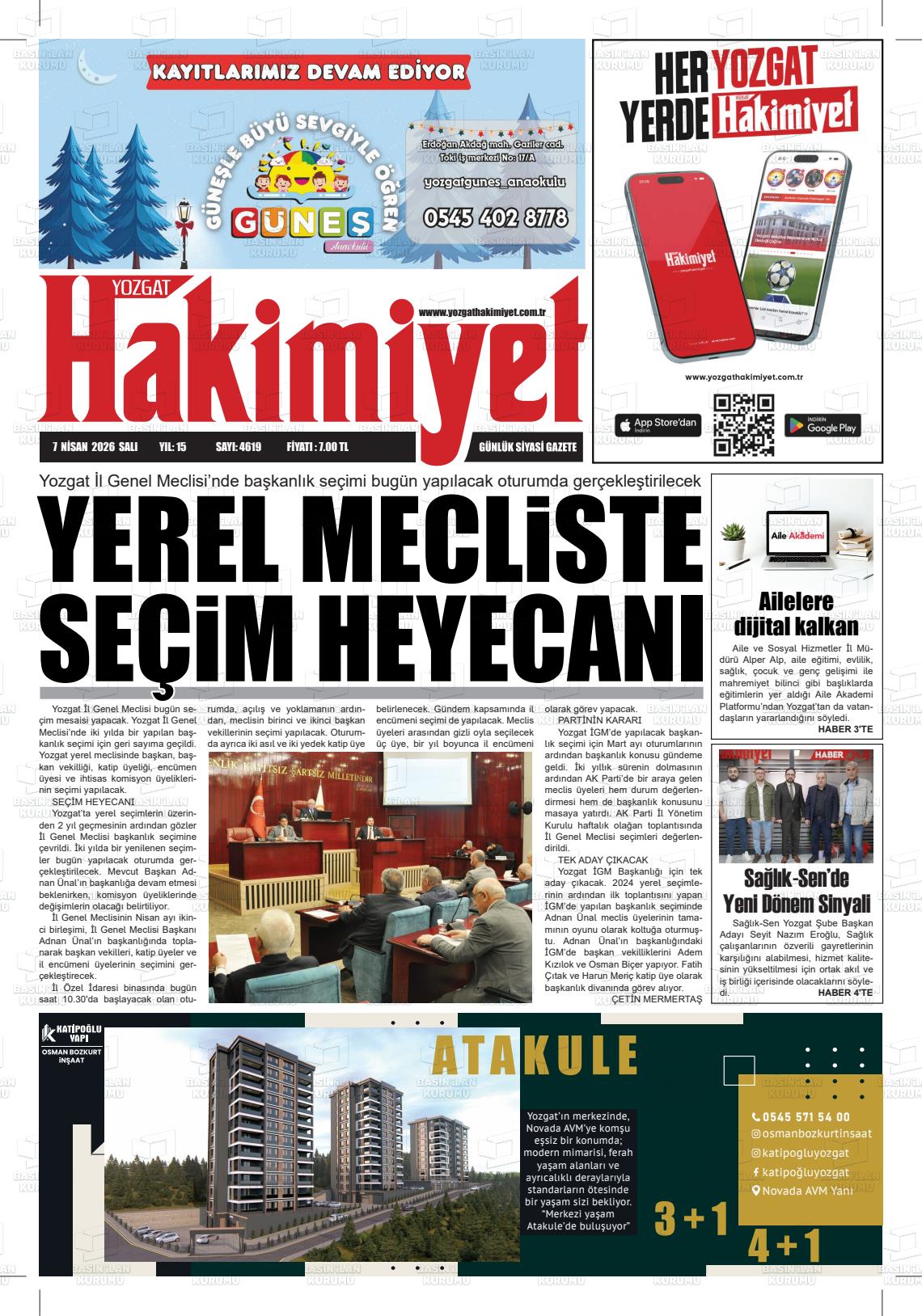 Yozgat Yerel Gazeteleri 07 Nisan 2026, Salı Günü Manşeti